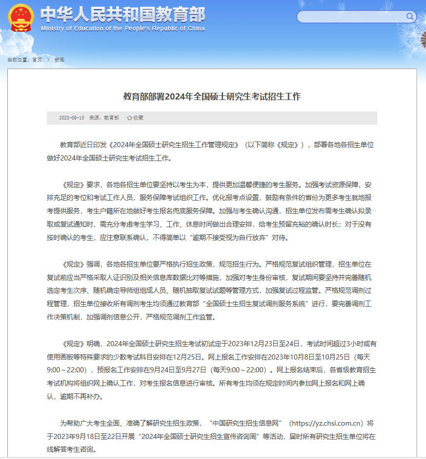 教育部部署2024年全国硕士研究生考试招生工作